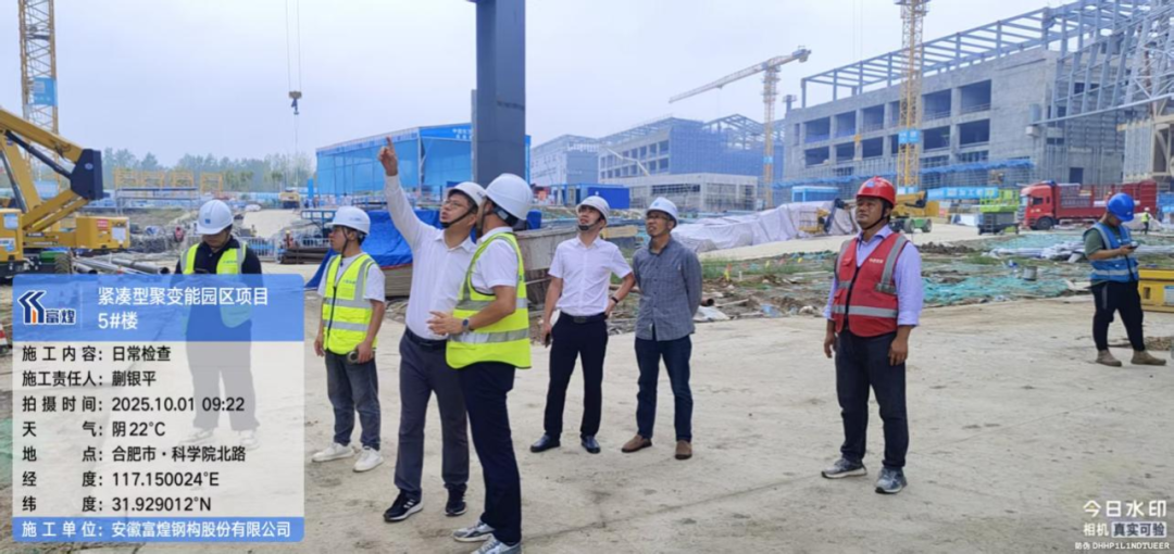 10月1日,國慶節(jié)當天,富煌鋼構總工程師童敏便帶隊來到緊湊型聚變能實驗裝置園區(qū)鋼結構工程項目現(xiàn)場。他仔細檢查了高空安裝作業(yè)的安全防護措施,詳細詢問了節(jié)假日期間的施工組織安排,并重點查閱了安全交底記錄與特種作業(yè)人員持證上崗情況。“越是節(jié)假日,越要繃緊安全這根弦。領導帶班不是走形式,而是要真正發(fā)現(xiàn)問題、解決問題。”童敏在檢查中再三強調。