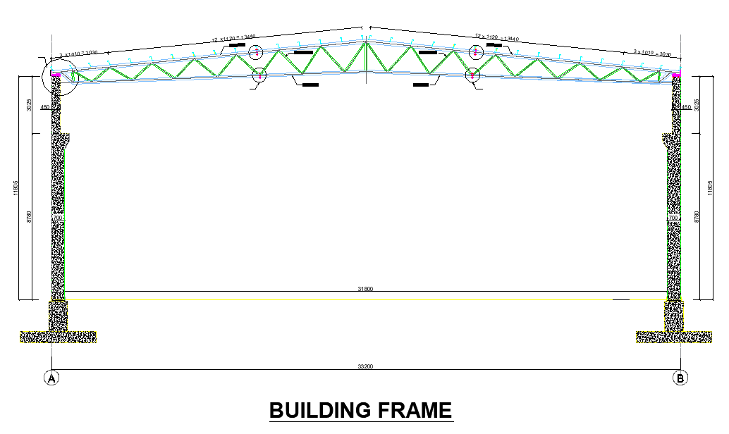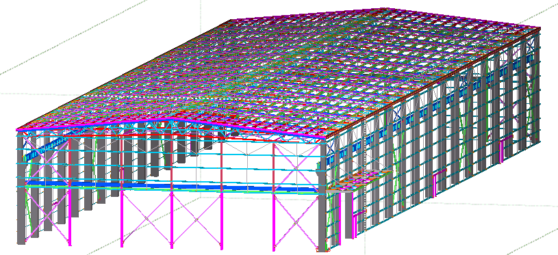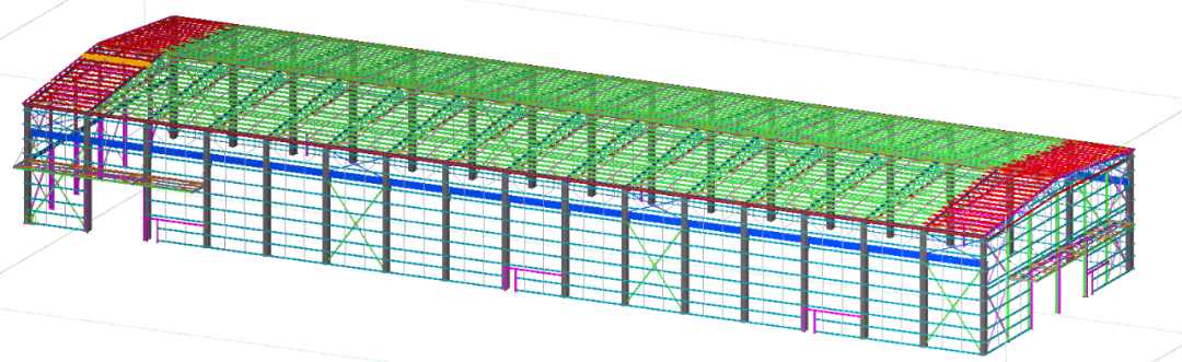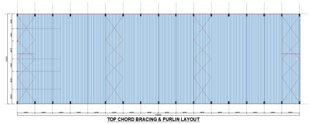 該項(xiàng)目為桁架式輕鋼屋面廠房結(jié)構(gòu),總長(zhǎng)104米,寬33.2米,檐口高度12米,主體采用平面矩形管桁架結(jié)構(gòu),并在桁架上下弦設(shè)置屋面支撐。項(xiàng)目涵蓋鋼屋架、檁條、抗風(fēng)柱、吊車梁及雨棚等部分的設(shè)計(jì)與加工制作,總用鋼量約170噸。項(xiàng)目設(shè)計(jì)充分考慮當(dāng)?shù)厥褂眯枨螅v向布置兩臺(tái)10噸吊車,西側(cè)山墻面另設(shè)5噸吊車,結(jié)構(gòu)整體坐落于已完工的混凝土柱上,兼顧實(shí)用性與安全性。