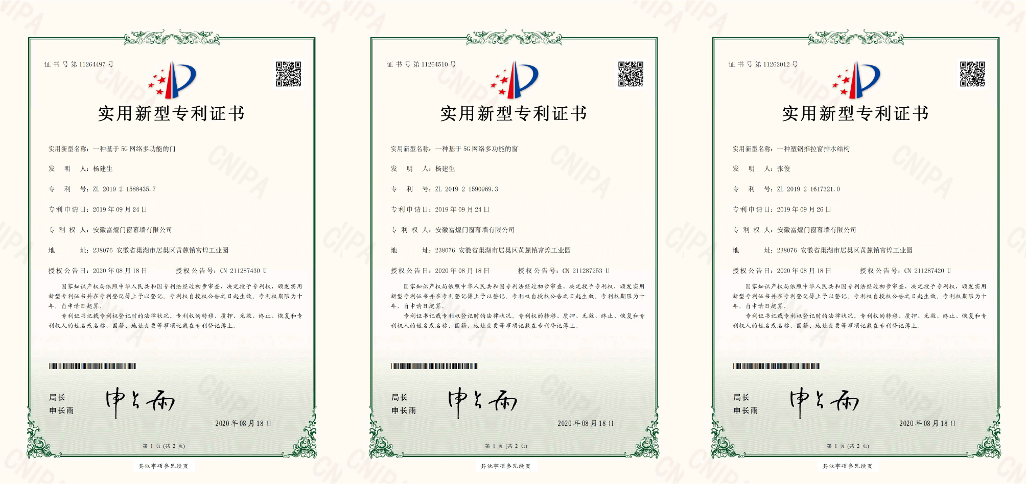 富煌門窗幕墻榮獲三項實用新型專利